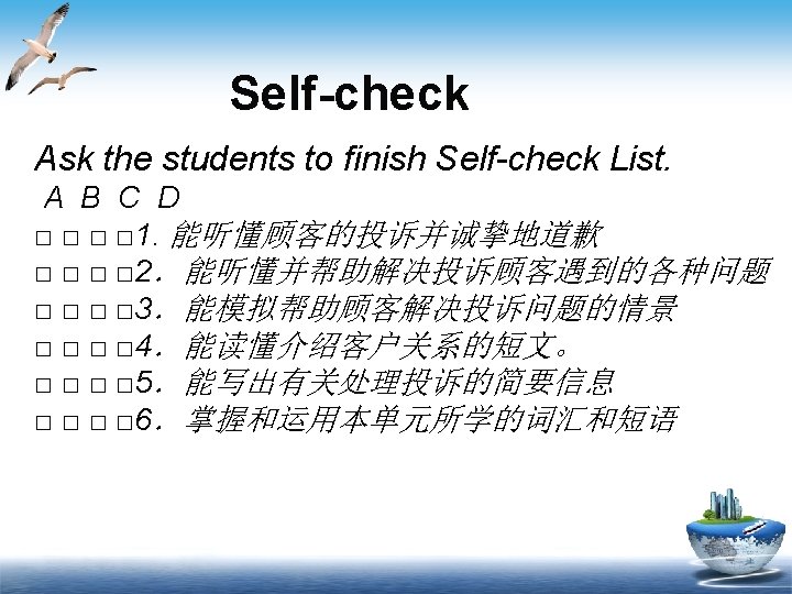 Writing v Translate the Chinese given in the brackets and practice. v 1. A:Our room isn’t ready for us. There are (浴室里没有毛巾). B: I’m so sorry, madam. These things should have been ready for you. v 2. A: Waiter, I’d like to (投� ). B: Sorry, sir. What’s it about? v 3. A: The glass is dirty and the knife isn’t sharp. B: You know this is quite unusual. I promise (� 种事情不会再次� 生).