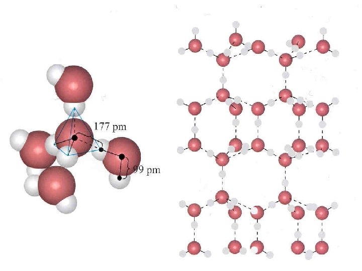 Voda je za normální teploty bezbarvá, v silné vrstvě namodralá kapalina bez chuti a zápachu. Její teplota varu a tání je (100°C a 0 °C)tvoří základní body Celsiovy teplotní stupnice. ( tlak ? ) Při přechodu do pevného stavu vzrůstá objem o 10% a led plave na vodě, protože má menší hustotu než kapalná voda. Molekuly vody jsou lomené, kovalentní vazby O-H jsou silně polární, Dva volné (nevazebné) elektronové páry na kyslíku a polarita vazeb způsobují, že molekuly vody jsou polární (mají dipólový moment) Izolované molekuly H 2 O jsou jen ve vodní páře. V kapalné vodě se jednotlivé molekuly sdružují (asociují) prostřednictvím vodíkových vazeb. …tepelná vodivost, povrchové napětí, velké měrné teplo
