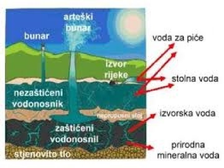 Prirodna izvorska voda ❖ IZVORSKA – dobivena iz podzemnih ležišta ili bušenih izvora zaštićenih od svih vrsta onečišćenja. ❖ Izvorska se voda može upotrebljavati za proizvodnju bezalkoholnih napitaka.