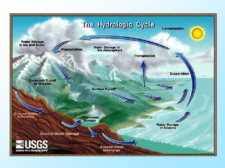 Kolobeh vody v prírode q q q Zem prijíma žiarenie zo Slnka, zemský povrch sa zahrieva, voda sa premieňa na paru, ktorá vystupuje do atmosféry. V chladnejšom prostredí atmosféry sa vodné pary kondenzujú, tvoria oblaky, v kvapalnej alebo tuhej forme padajú na zemský povrch a začnú ihneď stekať po ňom alebo do neho vnikať. Časť spadnutých zrážok sa vyparí a pokračuje naďalej v obehu.