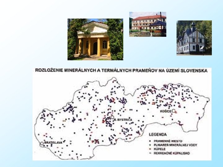 Slovenské kúpele • Sliač • Trenčianske Teplice • Turčianske Teplice • Rajecké Teplice • Sklené Teplice • Lúčky • Piešťany • • • Bardejov Smrdáky Dudince Nimnica Číž Korytnica