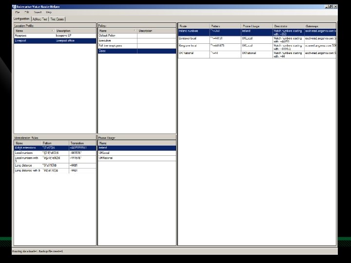 Authorisation/Routing/Dialling Four building blocks Location profiles Collections of Normalisation Rules Voice policies Contain Phone Usages Routes Associated with Phone Usages This session doesn’t cover planning or theory Attend UNC 305 to learn about that