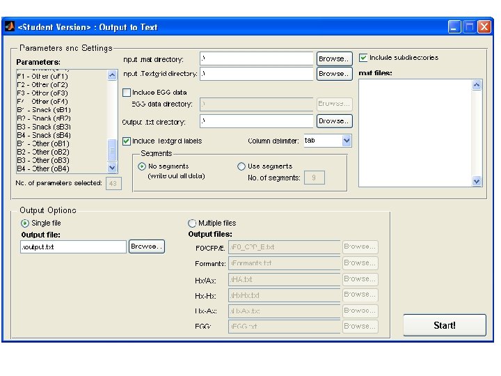 Module: Parameter estimation User specifies: • Where to find. wav files to analyze, and where to save. mat files of results • Acoustic parameters to be calculated (next slide) • whether to limit analysis to segments in Praat textgrid for each file (next slide) • whether to display waveform of each file during its processing