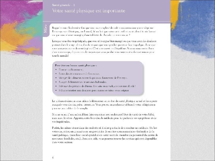 Rencontre avec nos mamans • Dans la série Rencontre avec nos mamans, l’équipe du projet de la Trousse d’outils pour la santé mentale des mères vous présente descriptions de cas tirées de l’expérience vécue de nos cliniciens en santé mentale et du personnel de notre Centre de ressources familiales partenaire. • Ces mamans vivent des expériences et des problèmes courants qui vous mettront au défi de définir votre rôle et votre contribution dans leur bien-être. Ces mamans vous fournissent également des exemples de comment vous pourriez utiliser les ressources de la Trousse dans votre travail. • Sortez un exemplaire de la Trousse afin de pouvoir vous y référer alors que vous faites la Rencontre avec nos mamans. • Vous pouvez aussi imprimer cette présentation et y noter vos remarques.