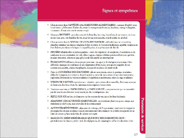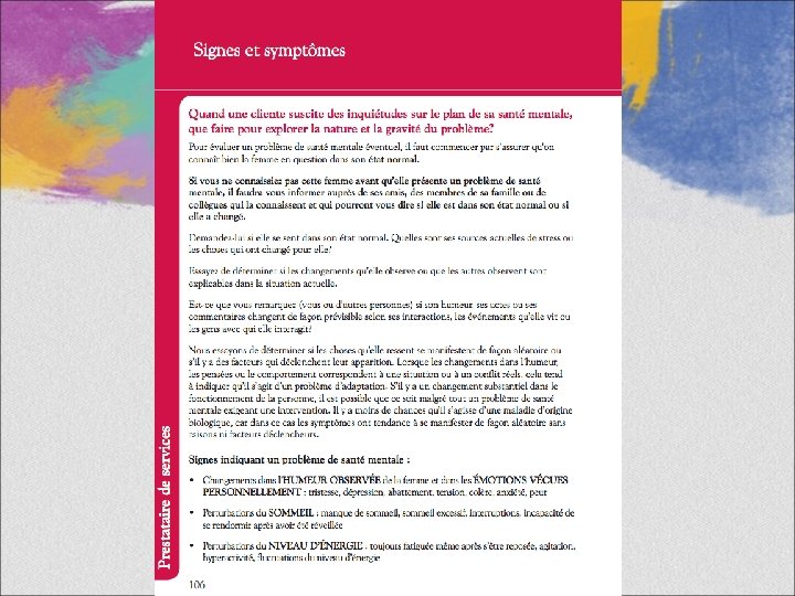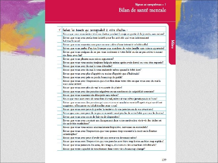 Rencontre avec nos mamans Sadira • Vous pouvez revoir les pages 106 et 107, Signes et symptômes, qui vous rappellent comment se présentent les problèmes de santé mentale. • La page 109 permet d’établir un Bilan de santé mentale, que vous pouvez aider Sadira à remplir et à interpréter.