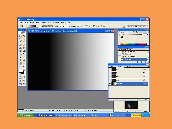 Et cliquer OK Des petits traits clignotants apparaissent à l'endroit du gradient Revenir sur calques et cliquer sur arrière plan Barre d'outil en haut, " image ", " réglage ", " niveaux " Une autre boîte de dialogue s'ouvre