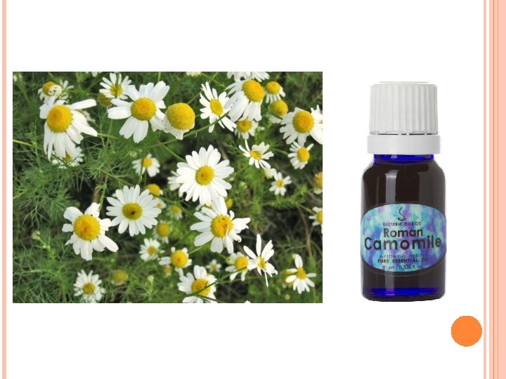 CHAMOLMILE FLOWERS (ROMAN CHAMOMILE) Chamomile flowers are the expanded flower-heads of Chamomile nobile (Anthimes nobilis) (f. Compositae). The flowers are collected in dry weather and carefully dried. The crop is often damaged by wet weather and discoloured flowers then often obtained fetch a much lower price than those having good colour. Chamonile contains 0. 4 -1. 0% of volatile oil which is blue when freshly distilled owing to the presence of azulene. Other components of the oil are n-butyl angelate (principal), iso-amyl angelate, tridecanal, pentadecanal and terpenes.