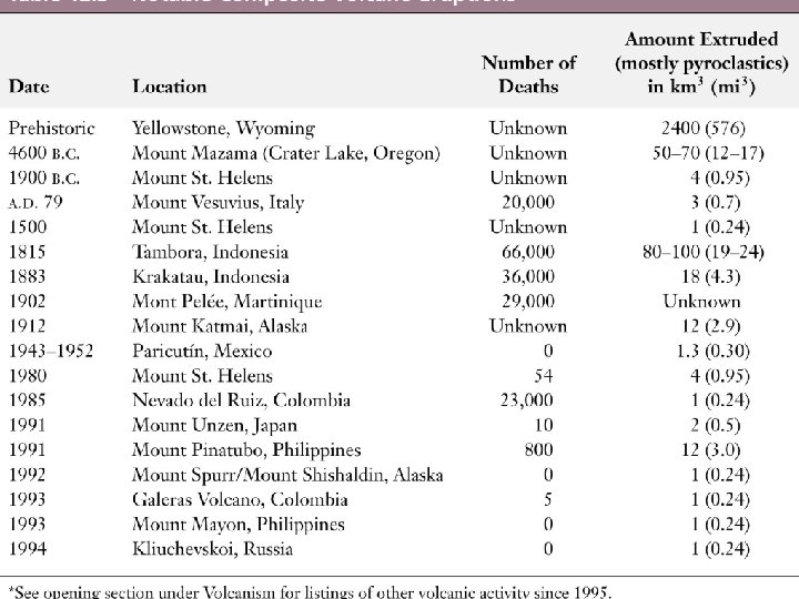 EXPLOSIVE ERUPTIONS • Found at subduction zones • Magma low temp (800 degrees C), high viscosity, does not flow easilty, more felsic mineralogy, gases trapped, hard to predict explosions • Forms composite volcanoes, cinder cones, calderas, aerial bombs, nuee ardente gas flows, very destructive