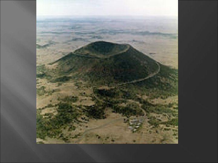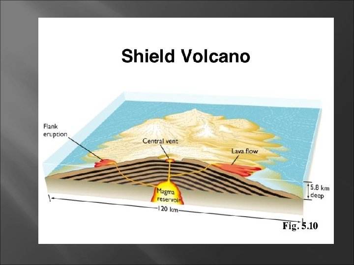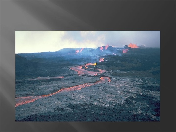 2. Shield volcano: Non-explosive; mafic lava Divergent boundaries; rift eruption or hot spot Lava quietly flows from the vent The mountain covers a large area; gently sloped sides Dome-shaped mountain Ex. Mauna Loa, HI; Iceland