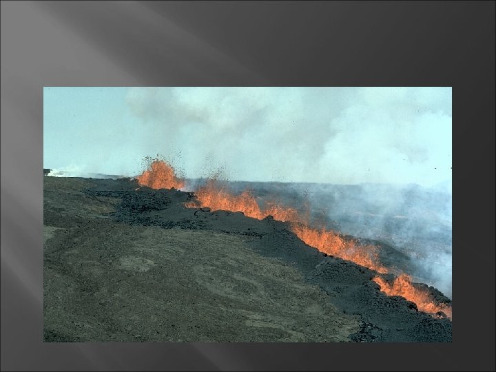 Kinds of Eruptions 1. Rift eruptions: Occur at long, narrow fractures in the crust Occur at divergent boundaries May be on the ocean floor or on land Non-explosive eruptions; mafic lava EX. Spreading centers such as the Mid-Atlantic Ridge