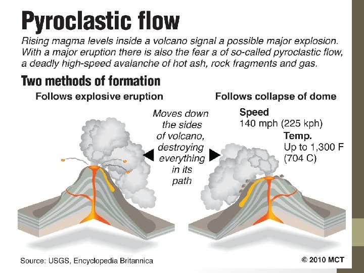 Pyroclastic flows • are high-density mixtures of hot, dry rock fragments and hot gases that move away from the vent that erupted them at high speeds (hundreds of miles per hour). Mt. Pinatubo