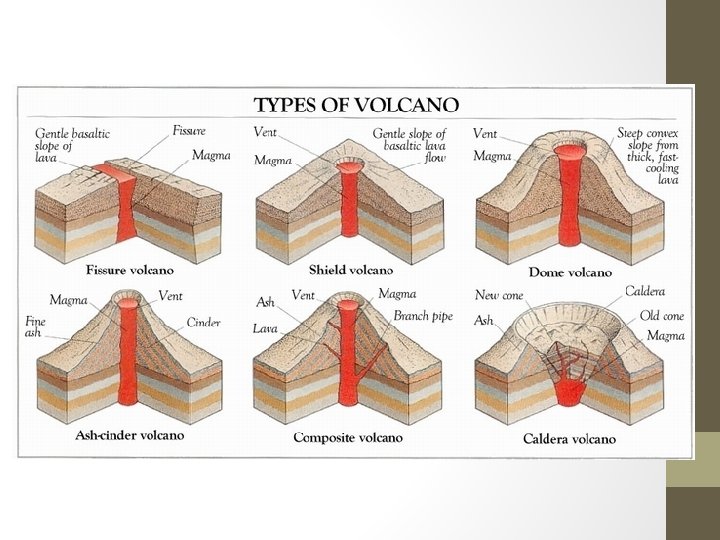 Lava Types: • • Pahoehoe – looks like rope braids (slow cooling) Aa – rough jagged blocks (quick cooling) Andesite – “sticky mud” Pillow Lava - cools underwater and forms a rounded pillow shape rock