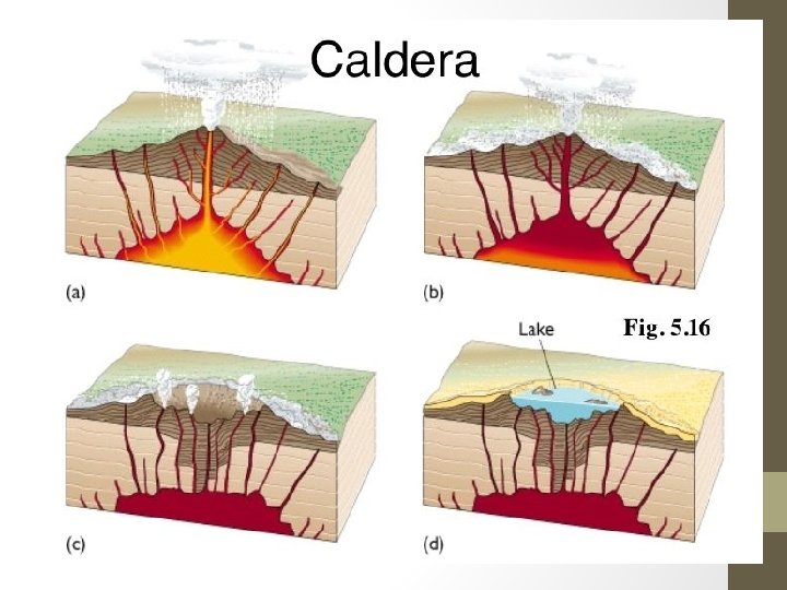 Caldera Formation: • A) A Volcano’s pressure starts to build up • B) The Volcano releases large amounts of Lava • C) As the Lava is released, the pressure decreases and the volcanic mountain begins to collapse, forming a concave shape in the center of the volcano. • D) The center of the volcanic mountain may begin to fill with water and form a lake. (Crater Lake in Oregon should actually be called Caldera Lake!)