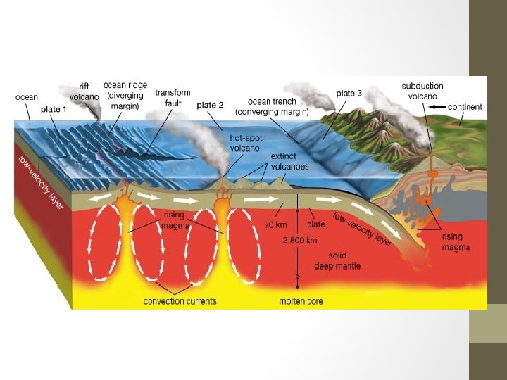 2. Volcanoes at Convergent Boundaries (Subduction) • Subducting plate increases the amount of water in the asthenosphere, which lowers the melting temp. • As the subducting crust is pushed lower, it melts into magma. • • When continental and oceanic plates converge, a volcano forms on land. • • When 2 oceanic plates converge together, a volcano forms an island arc.