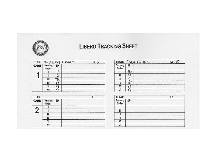 Douglas 9/11/2021 Varsity 1 4 1 6 4 R 7 c 9 -l 11 2 3 5 -l 6 Sx 6/4 Jones, Rob 5 Wheatland 9 -12 8 -5 7 8 -l 15 Douglas X / / / / 3 c 1 -l 4 , 6 2 3 4 9 9 10 11 5 12 , 3 11 9 8 / Smith, Mary Douglas Wheatland / -l 5 Tx Sx 3/12 6 Tx 13 -l RS 12 7 When the Libero serves, a triangle is drawn around the service order number and points scored in both the individual and running score sections. 8