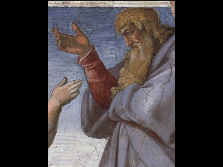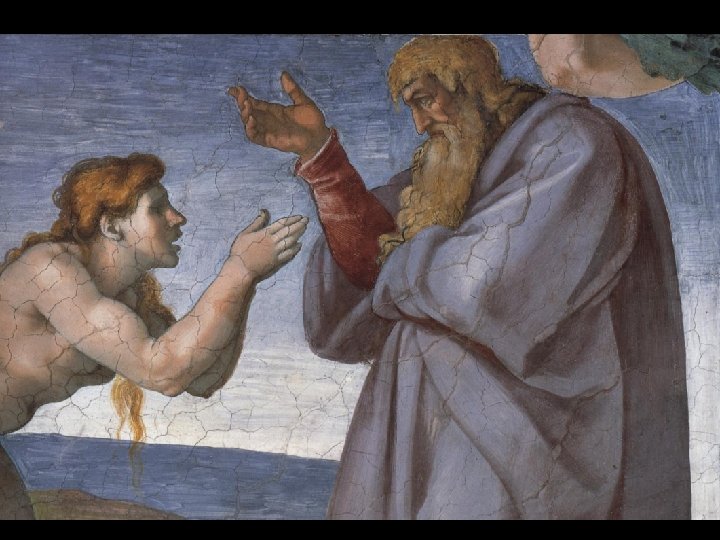La figura paterna di Dio occupa tutta l’altezza del dipinto: sembra compresso nello spazio pittorico, che non può contenere la sua immensità. . Serio e raccolto in se stesso, nel suo atto creatore, Dio dirige il suo sguardo sulla compagna di Adamo. La lunga barba fluisce abbondantemente sul petto. L’espressione della figura unisce dignità e forza creatrice.