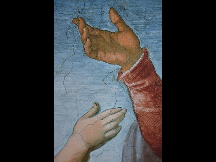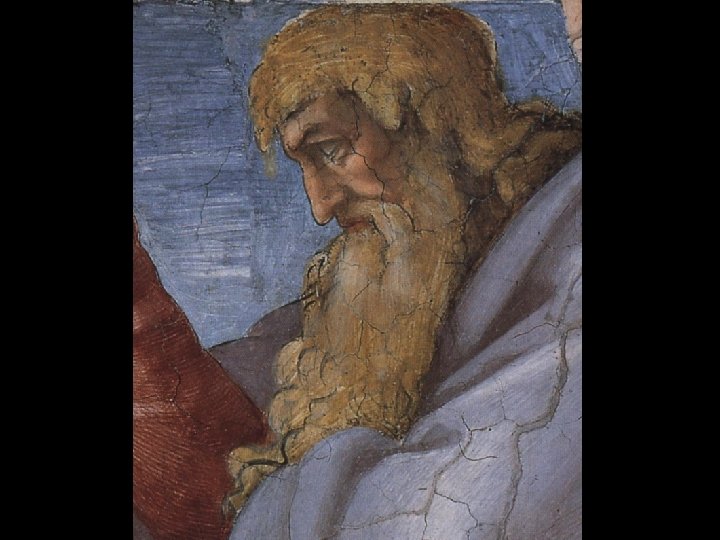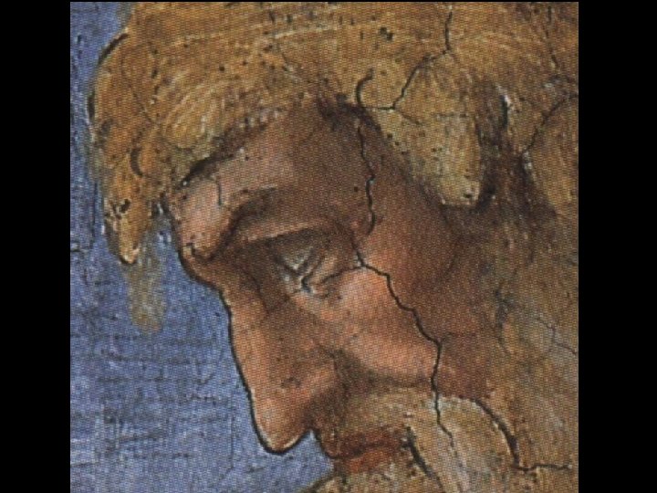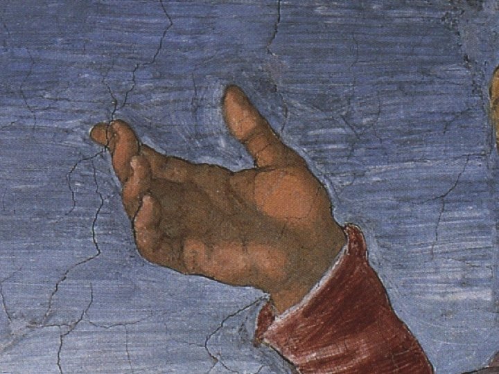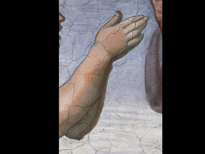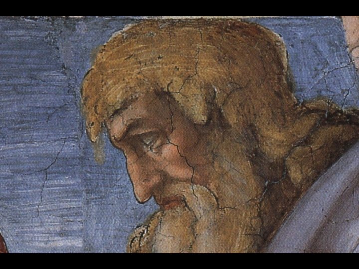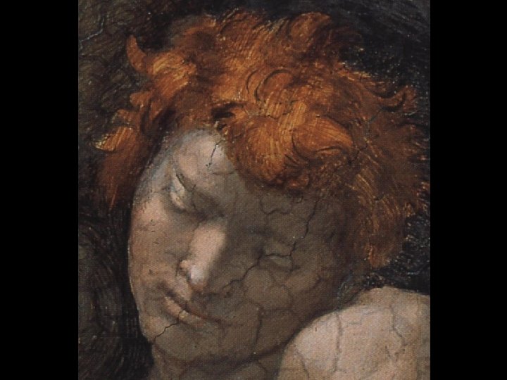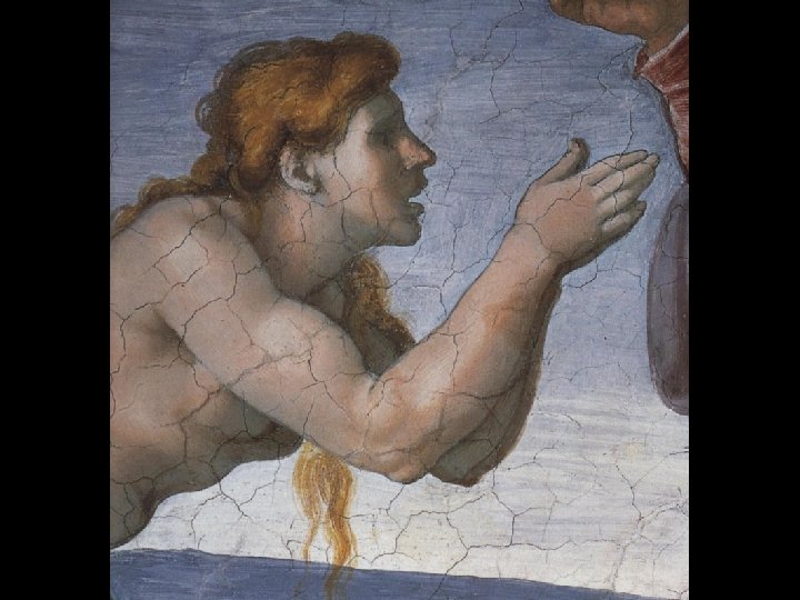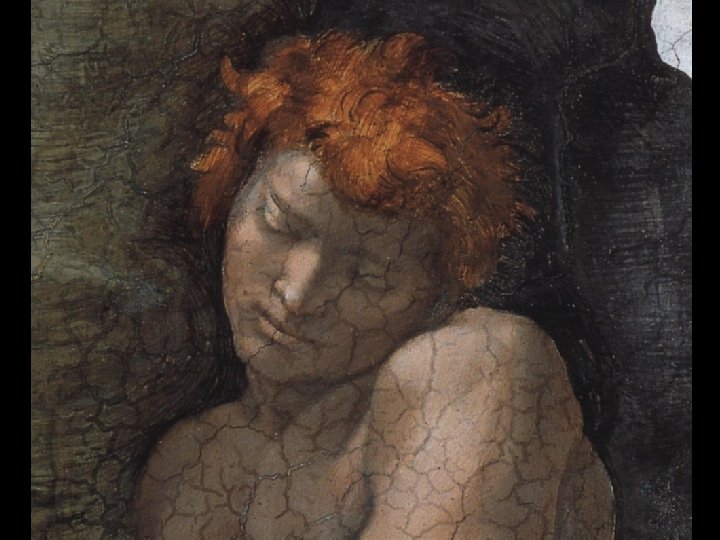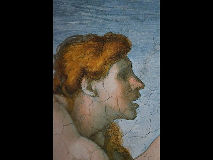 Distoglie il viso da Eva e dal Creatore volgendosi a sinistra, verso il basso.
