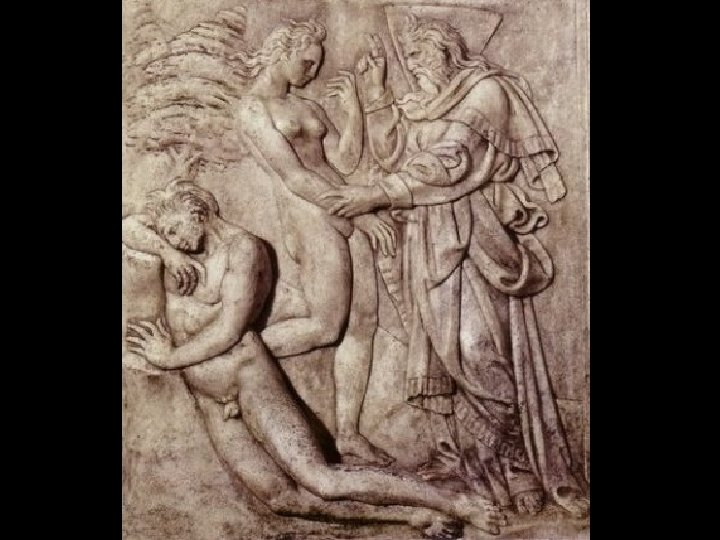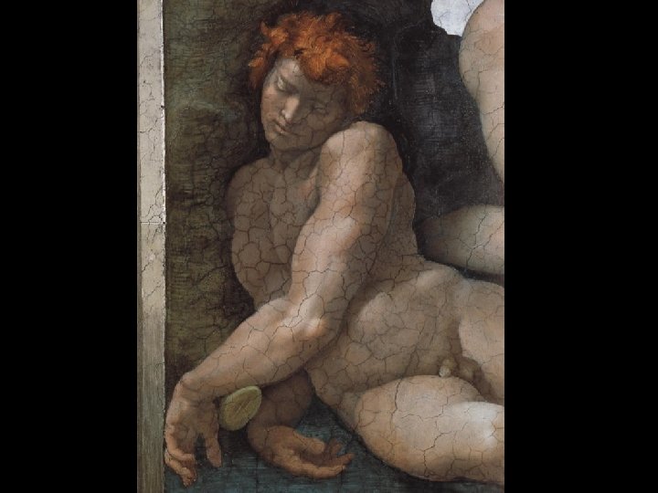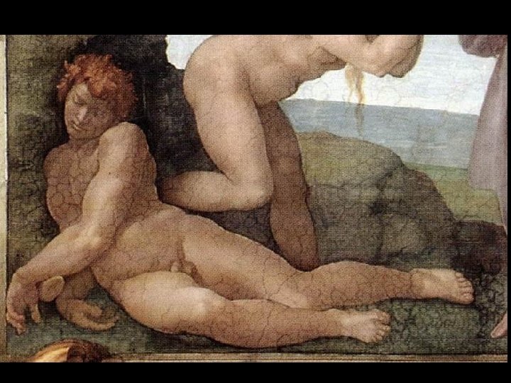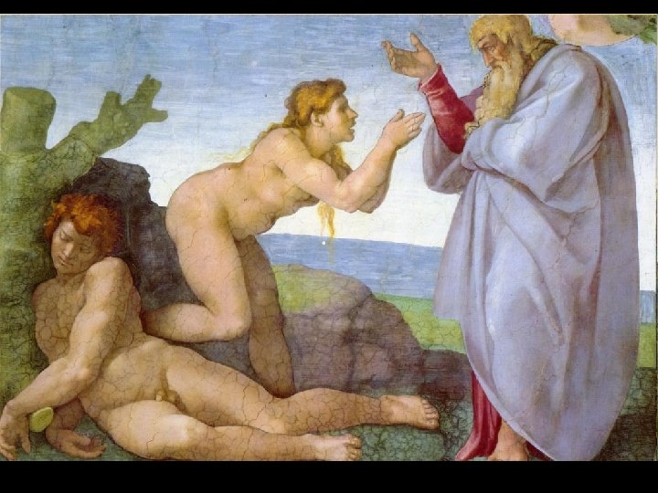 Tra Adamo e Eva Michelangelo ha dipinto un masso roccioso scuro che mette in relazione le due figure nude, ma allo stesso tempo le separa, dato il colore scuro della pietra.