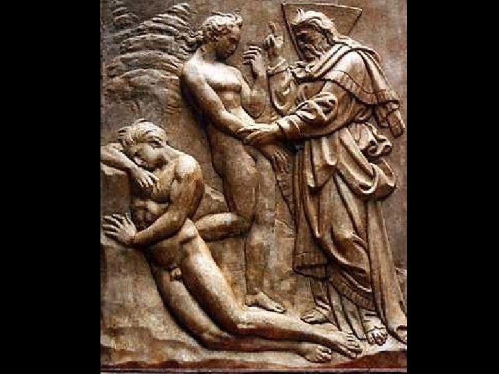 Poco di sotto a questa in una altra istoria fé il suo cavar della costa della madre nostra Eva, nella quale si vede quegli ignudi l'un quasi morto per essere prigion del sonno, e l'altra divenuta viva e fatta vigilantissima per la benedizione di Dio. Si conosce dal pennello di questo ingegnosissimo artefice interamente la diferenza che è dal sonno alla vigilanza, e quanto stabile e ferma possa apparire umanamente parlando la maestà divina. G. Vasari