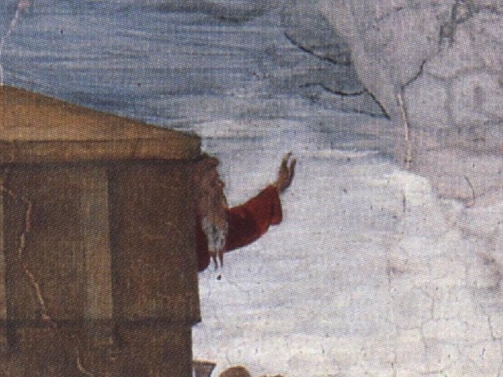 Poi Dio si ricordò di Noè, di tutte le fiere e di tutto il bestiame ch'erano con lui nell'arca; Dio fece allora passare un vento sulla terra e le acque cessarono. Gen 8, 1 Nei capelli e nelle estremità dei mantelli svolazzanti è chiaramente avvertibile è il vento che, secondo il testo biblico, avviò la conclusione del diluvio.