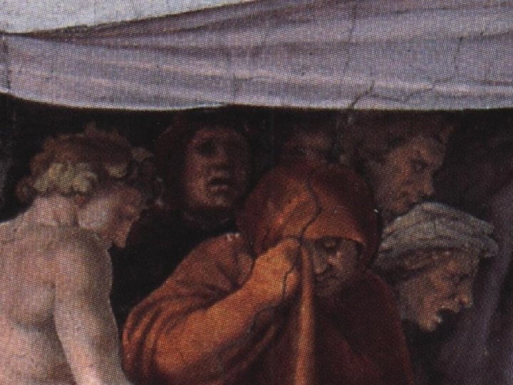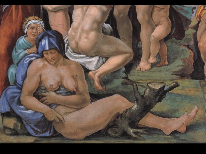 Usò l'arte medesima et il medesimo giudizio nella storia del Diluvio, dove appariscono diverse morti d'uomini, che spaventati dal terror di quei giorni, cercano il più che possono per diverse vie scampo alle lor vite. Perciò che nelle teste di quelle figure, si conosce la vita esser in preda della morte, non meno che la paura, il terrore et il disprezzo d'ogni cosa. G. Vasari