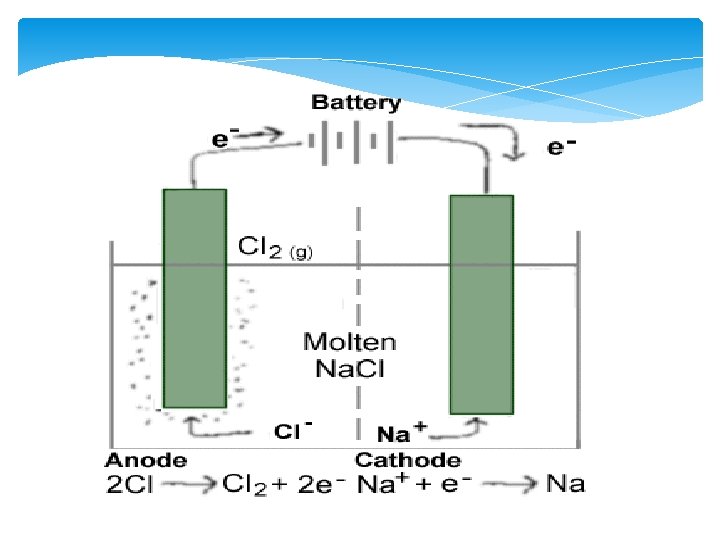 Uses of Electrolytic Cells 1. Electrolysis---process where a current is used to initiate the reaction and separate compounds into elements Can be used to isolate hydrogen and oxygen from water Or to isolate a reactive metal (Sodium) from sodium chloride 2. Electroplating—process where a metal is coated with a different metal Used for corrosion prevention or alloying
