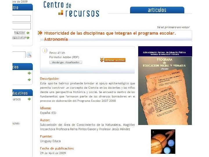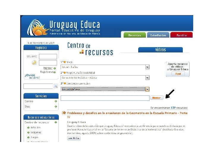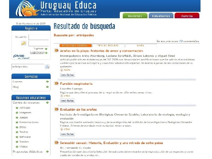 üEs un repositorio de recursos y servicios digitales orientados a los diferentes actores del sistema educativo: estudiantes, padres, directivos y, especialmente, maestros y profesores. Volumen Capacidad üOfrece recursos y orientaciones metodológicas que pueden ser utilizados por los docentes para enriquecer sus actividades de enseñanza (…). Martinis, Pablo: La incorporación de las TIC a la educación pública. Realidades y desafíos. En Una transformación en Marcha. 2005 -2009; ANEP. CODICEN; 2010.