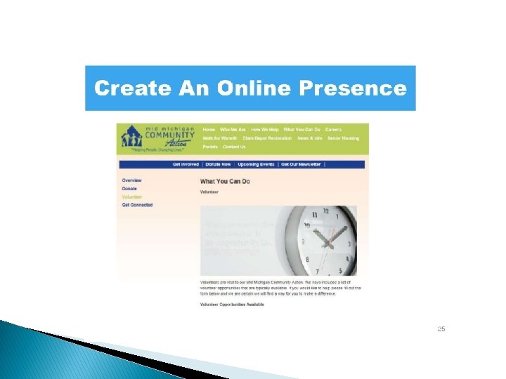 Marketing � Distribute brochures and posters � Make public service announcements on TV, radio, newspaper, movie theaters � Speak to community groups (faith-based, community forums) � Collaborate – churches, businesses, other nonprofits � Post to online venues (websites, Twitter, Youtube, Facebook, blogs) � Word of mouth � Talk to current volunteers and staff � Set up a booth at local events