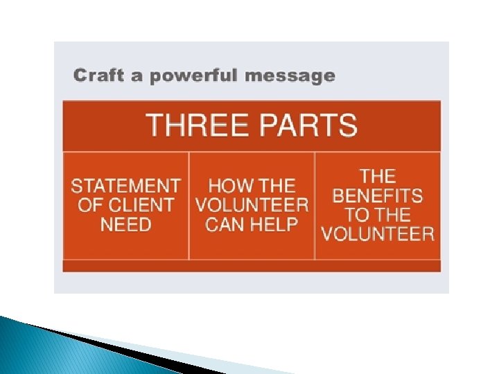 Questions to ask � Who is your target audience? � What strategies should be used to reach potential volunteers? � What are features of the position? � What would appeal to the volunteer about the position? � What would they consider a barrier? � What other things do you need to know about potential volunteers?