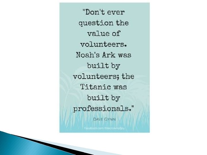 What makes volunteers stay? � Rewards � To know they are helping make the world a better place. � To be socially connected. � To learn something new. � Assigning appropriate tasks.