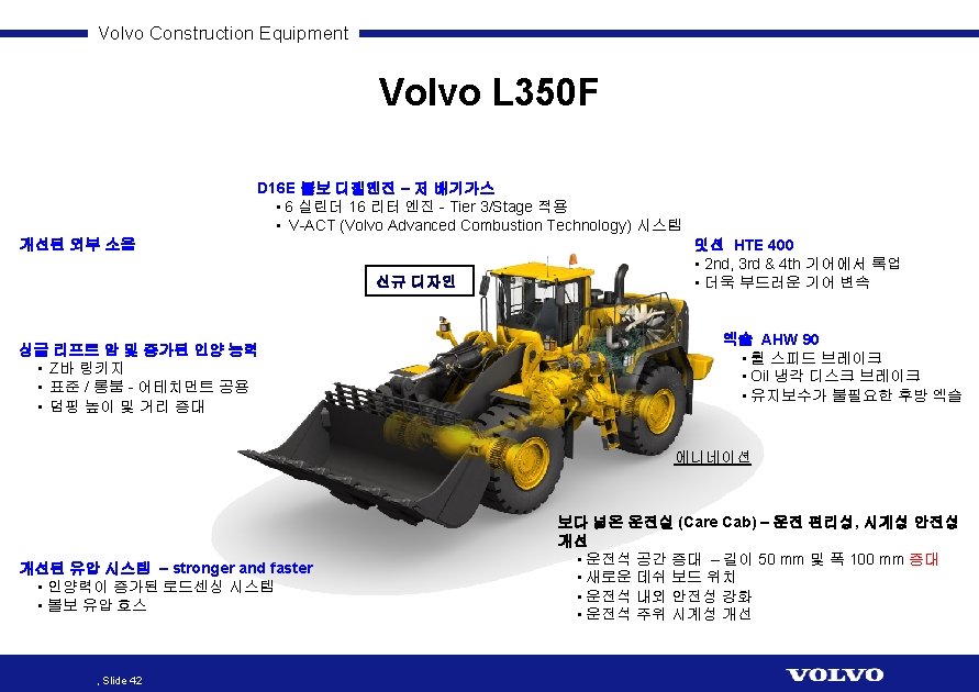Volvo Construction Equipment Volvo L 350 F - 일반 변경 내역 • Engine • Transmission • Axles • Steering • Frames • Cab • Styling • Hydraulics • Loader unit • Attachments • Options • Noise • Productivity , Slide 41
