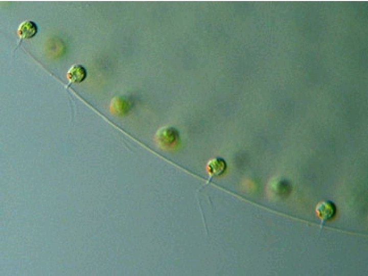 How does it move? • Each cell has two flagella, but they’re not the same; one is older than the other, and they move like in breast stroke • Ca+2 concentrations control which flagella dominates, allows the colony to turn, important for finding light or avoiding too much light • Flagella stick out of the colony and propel