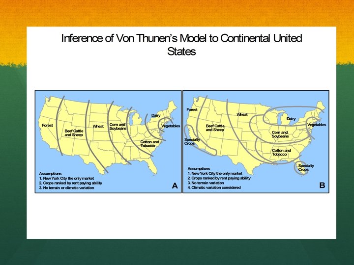 Contains six assumptions 1. There is only one market available, selfsufficient with no outside influence. 2. All farmers are market oriented, producing goods for sale. (Not subsistence. ) 3. The physical environment is uniform; there are no rivers or mountains. 4. All points at equal distances from the market have equal access to the market. 5. All farmers act to maximize profits. 6. The dietary preferences of the population are those of Germanic Europeans.