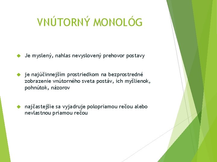 VNÚTORNÝ MONOLÓG Je myslený, nahlas nevyslovený prehovor postavy je najúčinnejším prostriedkom na bezprostredné zobrazenie vnútorného sveta postáv, ich myšlienok, pohnútok, názorov najčastejšie sa vyjadruje polopriamou rečou alebo nevlastnou priamou rečou