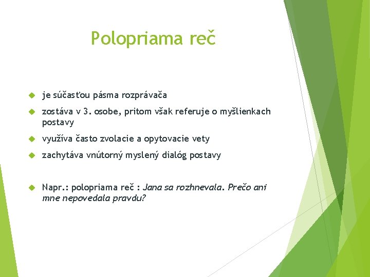 Polopriama reč je súčasťou pásma rozprávača zostáva v 3. osobe, pritom však referuje o myšlienkach postavy využíva často zvolacie a opytovacie vety zachytáva vnútorný myslený dialóg postavy Napr. : polopriama reč : Jana sa rozhnevala. Prečo ani mne nepovedala pravdu?