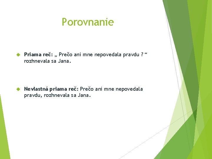 Porovnanie Priama reč: „ Prečo ani mne nepovedala pravdu ? “ rozhnevala sa Jana. Nevlastná priama reč: Prečo ani mne nepovedala pravdu, rozhnevala sa Jana.