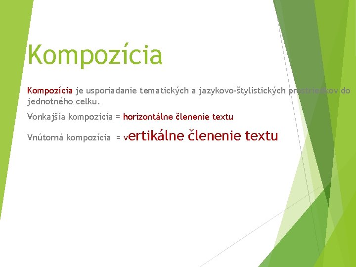 Kompozícia je usporiadanie tematických a jazykovo-štylistických prostriedkov do jednotného celku. Vonkajšia kompozícia = horizontálne členenie textu Vnútorná kompozícia = vertikálne členenie textu