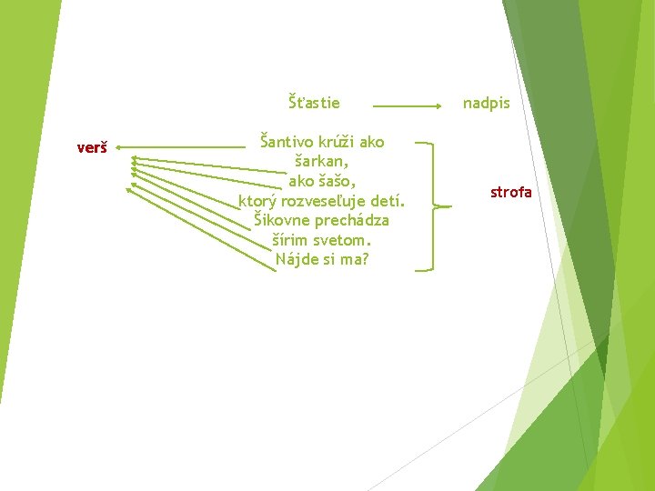 verš Šťastie Šantivo krúži ako šarkan, ako šašo, ktorý rozveseľuje detí. Šikovne prechádza šírim svetom. Nájde si ma? nadpis strofa