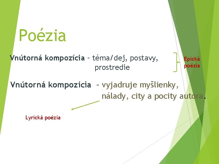 Poézia Vnútorná kompozícia – téma/dej, postavy, prostredie Epická poézia Vnútorná kompozícia – vyjadruje myšlienky, nálady, city a pocity autora. Lyrická poézia