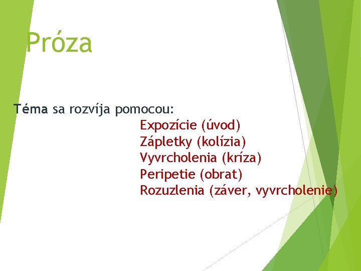 Próza Téma sa rozvíja pomocou: Expozície (úvod) Zápletky (kolízia) Vyvrcholenia (kríza) Peripetie (obrat) Rozuzlenia (záver, vyvrcholenie)