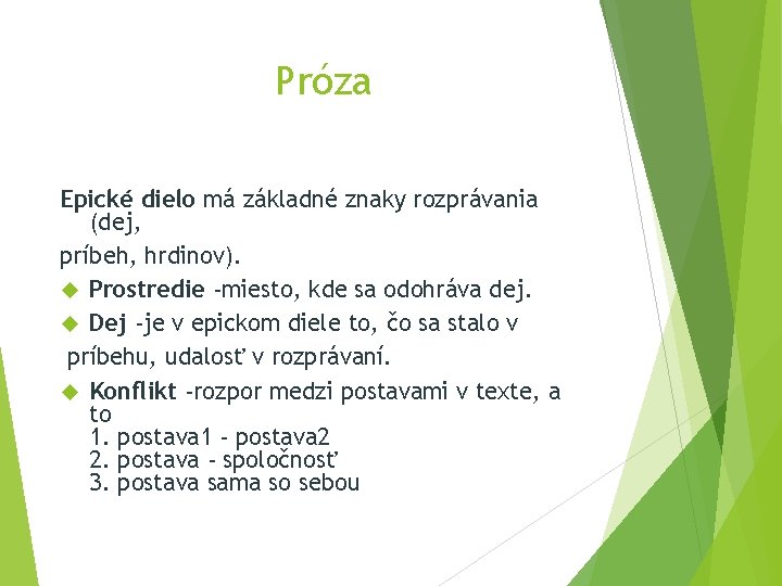 Próza Epické dielo má základné znaky rozprávania (dej, príbeh, hrdinov). Prostredie -miesto, kde sa odohráva dej. Dej -je v epickom diele to, čo sa stalo v príbehu, udalosť v rozprávaní. Konflikt -rozpor medzi postavami v texte, a to 1. postava 1 - postava 2 2. postava - spoločnosť 3. postava sama so sebou