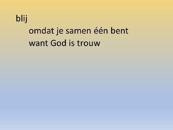 Liedboek 416: 1, 2, 3, 4 Ga met God en Hij zal met je zijn, jou nabij op al je wegen met zijn raad en troost en zegen. Ga met God en Hij zal met je zijn.