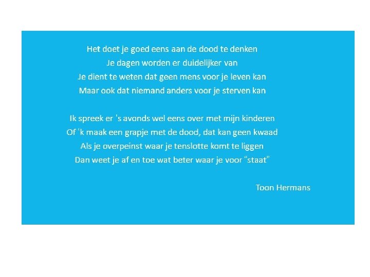 Tijdig praten over het levenseinde Waarom? U wilt dat de zorg aansluit bij uw wensen U kunt zich voor bereiden Uw nabestaanden zullen zich beter voelen U hebt meer kans, dat u overlijdt op de plaats die u graag wil • U kunt makkelijker agressieve zorg vermijden (beademing, reanimatie, IC opname) • En ook lagere zorgkosten • •