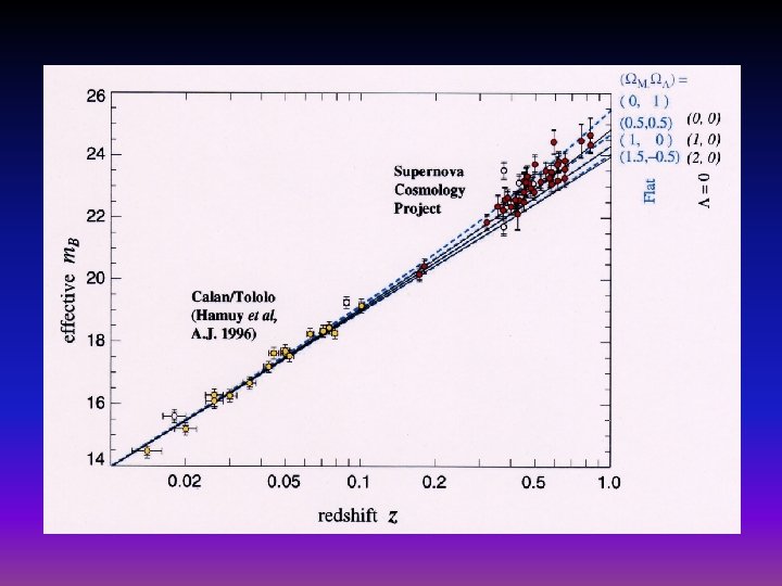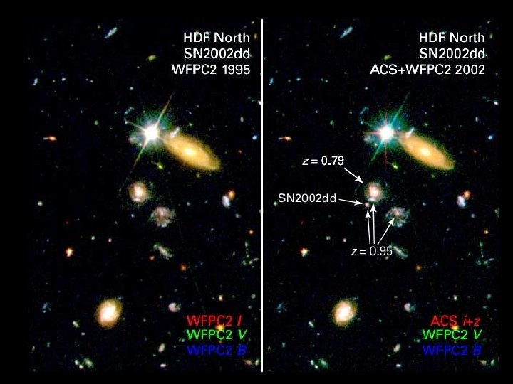 Supernova Typ Ia als Standardkerzen zur Bestimmung der Entfernung Supernova Typ Ia: Weißer Zwerg nahe Chandrasekhar-Grenzmasse sammelt Gas von Begleiter, Masse überkritisch: explosive thermonukleare Zündung von C, Weißer Zwerg explodiert identische Ursache identische Wirkung: identische absolute Maximums-Helligkeit identisches zeitliches Abklingverhalten Vorteil des Hubble-Teleskops: Auflösung von SNExplosionen auch in größter Entfernung (z ~ 1 und z > 1)