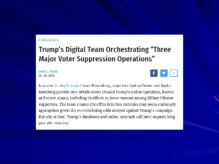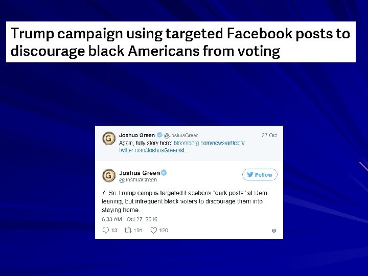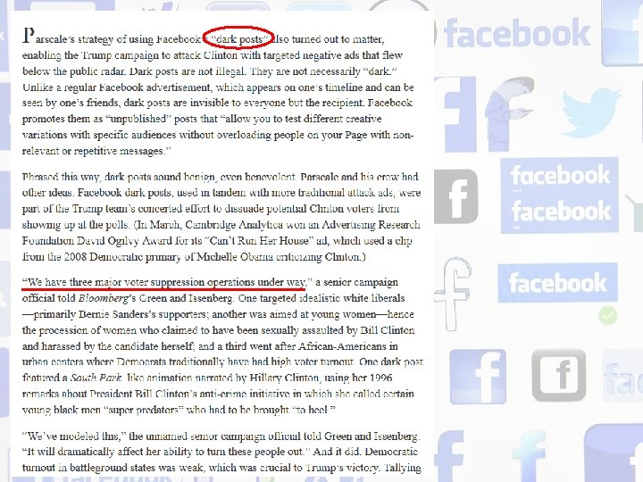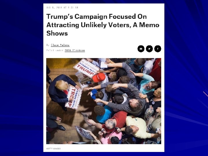 Obama’s Project Narwahl “The new megafile didn't just tell the campaign how to find voters and get their attention; it also allowed the number crunchers to run tests predicting which types of people would be persuaded by certain kinds of appeals. Call lists in field offices, for instance, didn't just list names and numbers; they also ranked names in order of their persuadability, with the campaign's most important priorities first. About 75% of the determining factors were basics like age, sex, race, neighborhood and voting record. Consumer data about voters helped round out the picture…”