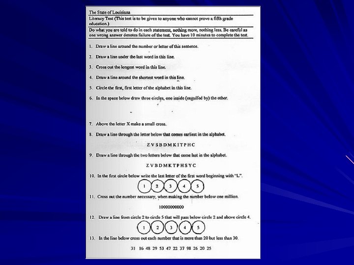 Consider this “literacy” test given by the state of Louisiana in the 1960 s: The test was to be taken in 10 minutes flat, and a single wrong answer meant a failing grade.