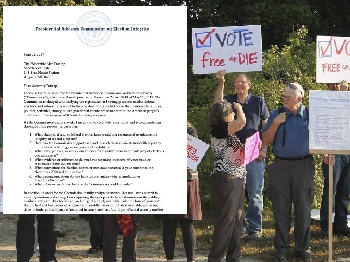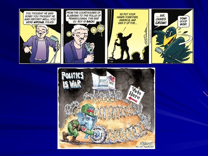 Vote Suppression Intimidation Poll taxes, literacy tests, grandfather clauses (Jim Crow) Disinformation Voter ID laws Targeted ads