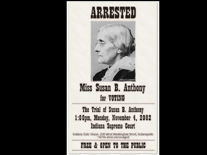 • In 1872, in an act of civil disobedience, a suffrage leader, Susan B. Anthony, insisted on voting in Rochester, New York. She was arrested for this act.