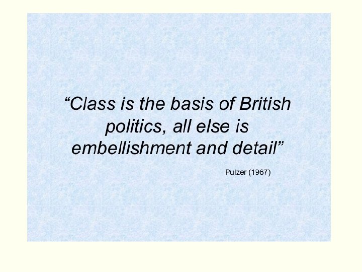 The influence of Social Class on Voting behaviour? As Peter Pulzer claimed in 1967 “class is the basis of British Politics – all else is embellishment and detail”. However, as we have seen there are many other factors affecting how and why people vote. So is Social Class the basis? Issues – it could be claimed that the ‘issues’ people are conserved with are linked to their social class. Health and Education may have broad appeal but issues surrounding benefit cuts and austerity may affect or appeal to one social class over another, as might issues surrounding Immigration or EU membership. Location/Geography – as already stated the reasons for the north/south divide relate to employment/income/wealth = class. They areas with more class AB tend to vote con, the areas with high concentration of DE, C 2 tend to vote lab. Party Leader – certain aspect of each party leader may appeal to different social classes. To some David Cameron is seen as a ‘posh’ ‘toff’ others may see him as educated. Nigel Farage attempts to appeal to the ‘common man’ appears a ‘man of the people’ and drinks pints.