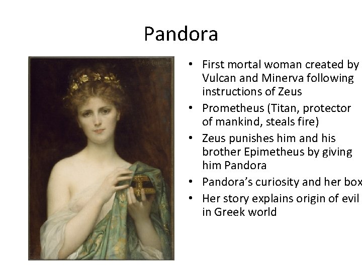 Pandora • First mortal woman created by Vulcan and Minerva following instructions of Zeus • Prometheus (Titan, protector of mankind, steals fire) • Zeus punishes him and his brother Epimetheus by giving him Pandora • Pandora’s curiosity and her box • Her story explains origin of evil in Greek world